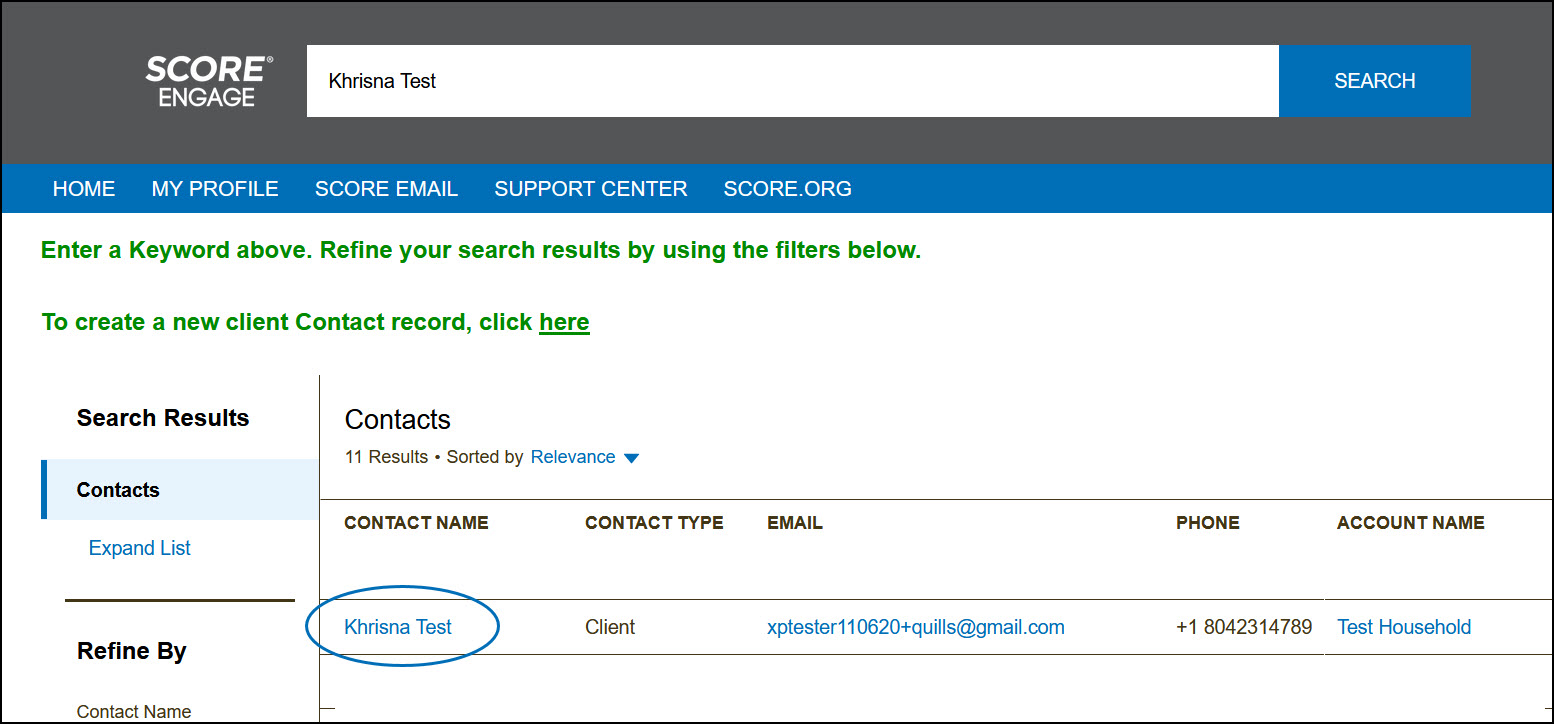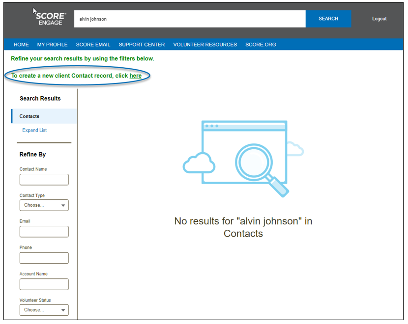 If a person has never requested mentoring services from SCORE, not migrated from CORE (no activity during FY19 or FY20), or if they were initially assigned to a chapter still on CORE but were reassigned to a chapter already live on Engage, you will need to create a client contact record for them in Engage.