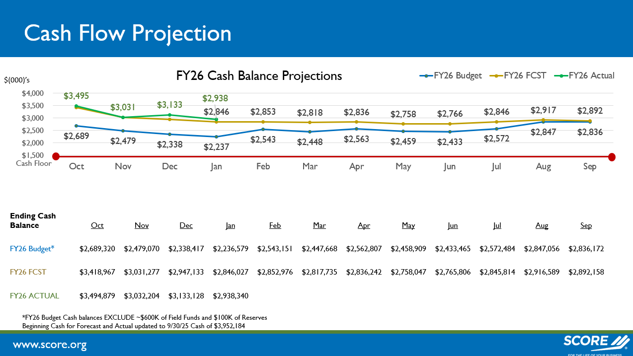 Access the latest monthly snapshots of SCORE’s financial performance to track progress against annual revenue goals, monitor operational expenses, and view updated cash flow projections.
